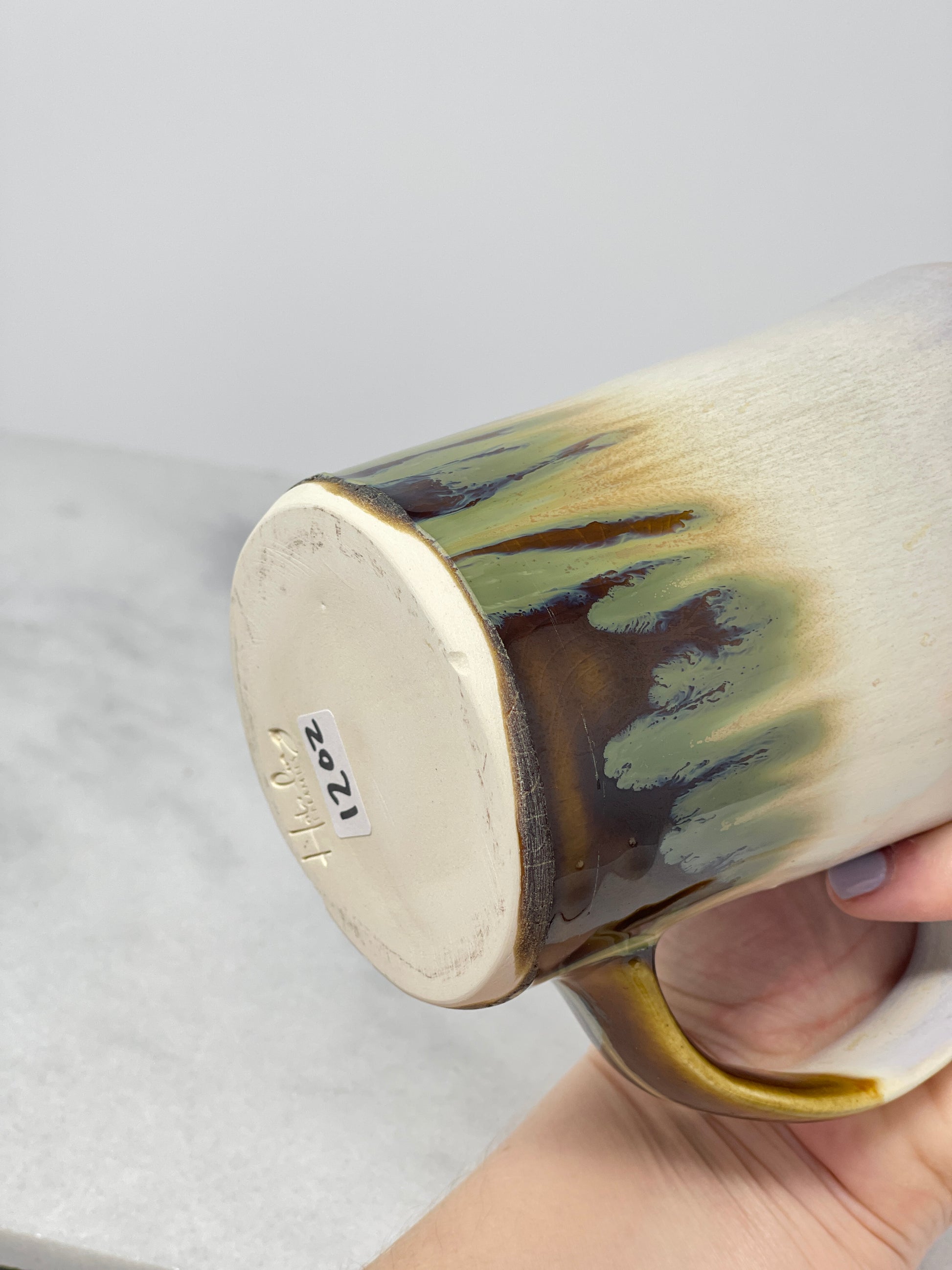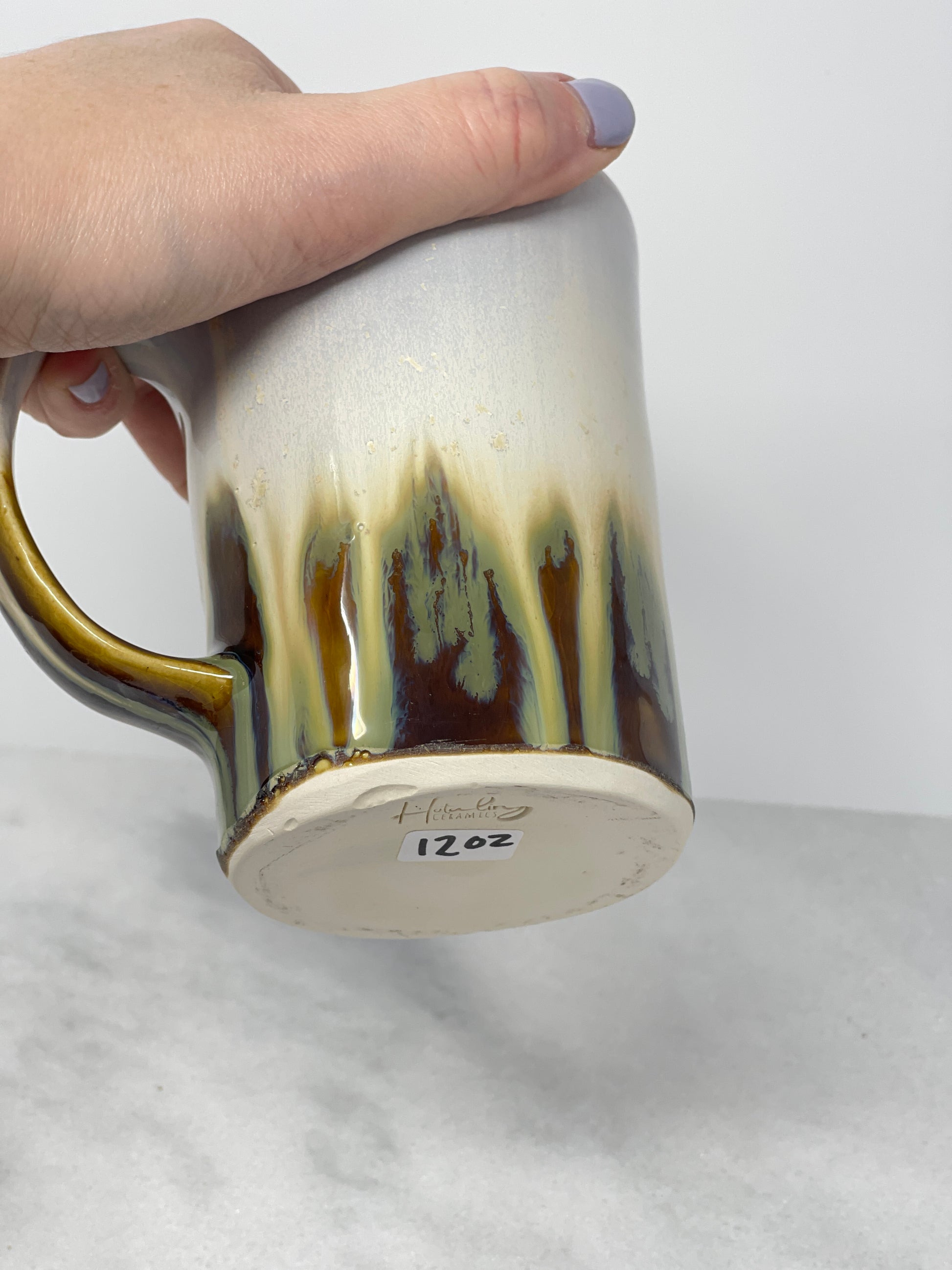 One-of-a-kind handmade stoneware right handled tumbler with glass straw.