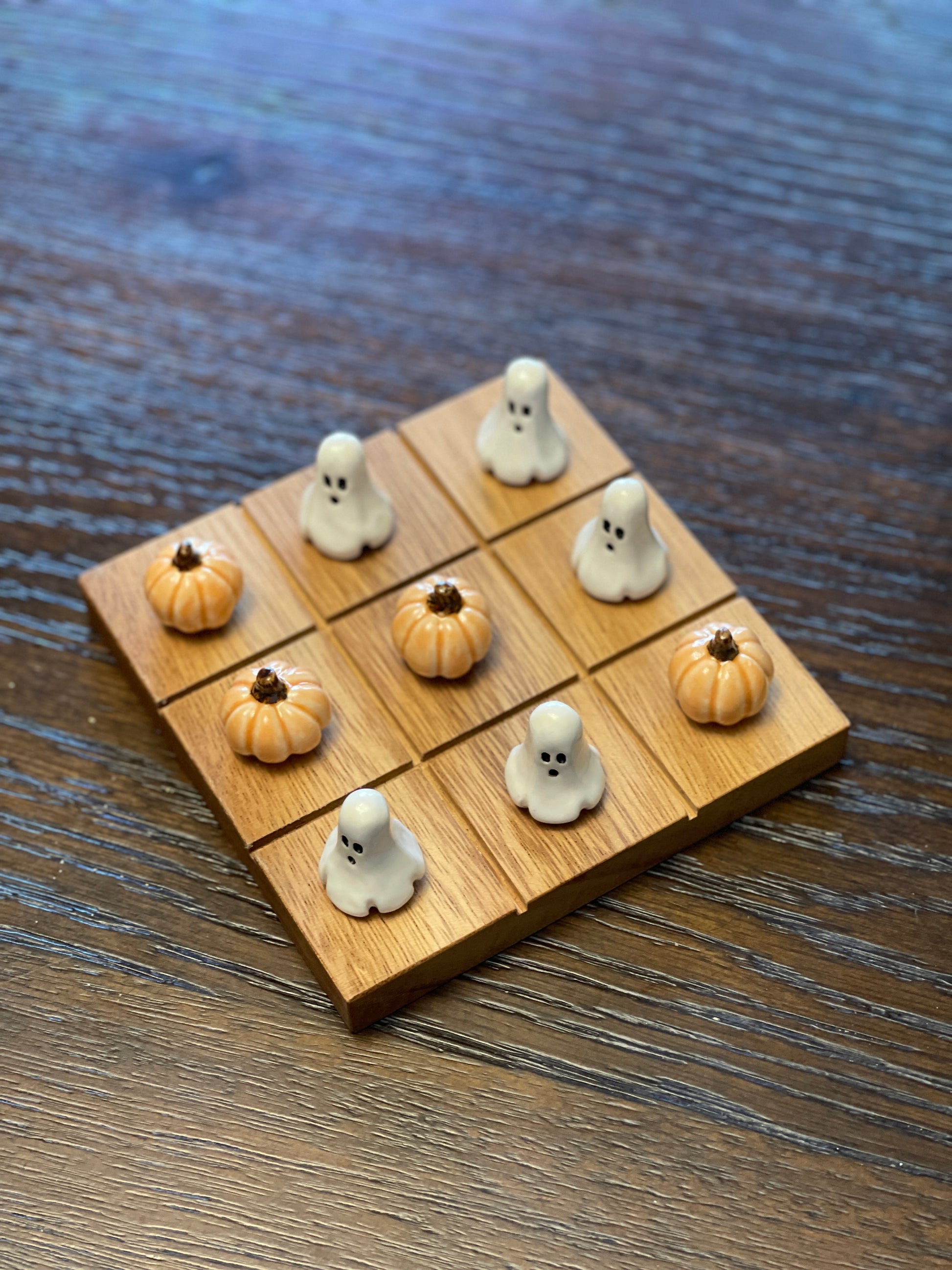 Your Tic Tac Toe will be made to order. You are not purchasing the exact set pictured. Photo is an example of what you will receive. Each set comes with 10 playing pieces (5 ghost buddies and 5 pumpkins). Pieces will come with a storage bag. Wooden board is approximately 5.5 inches x 5.5 inches in size.